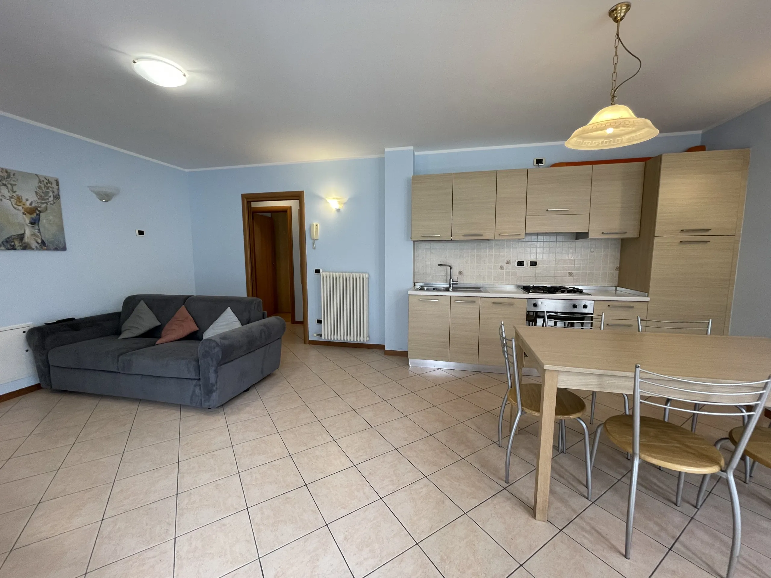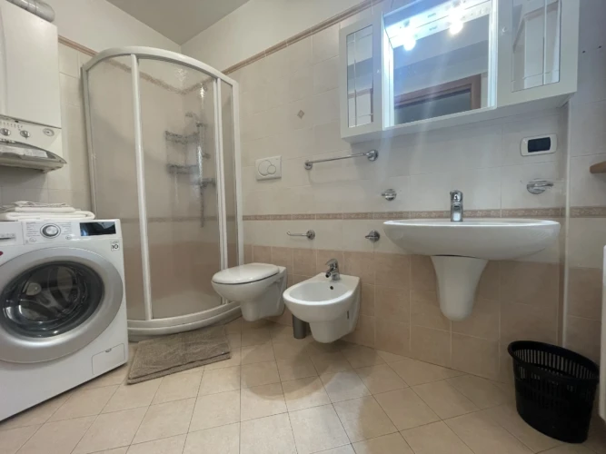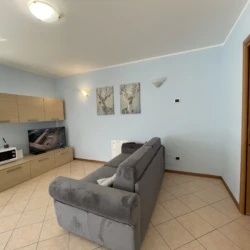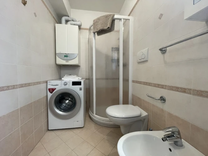 Ideale per famiglie e coppie, questo appartamento moderno e luminoso offre due camere da letto, bagno con doccia e lavatrice, e una zona giorno con divano letto e angolo cottura attrezzato.
