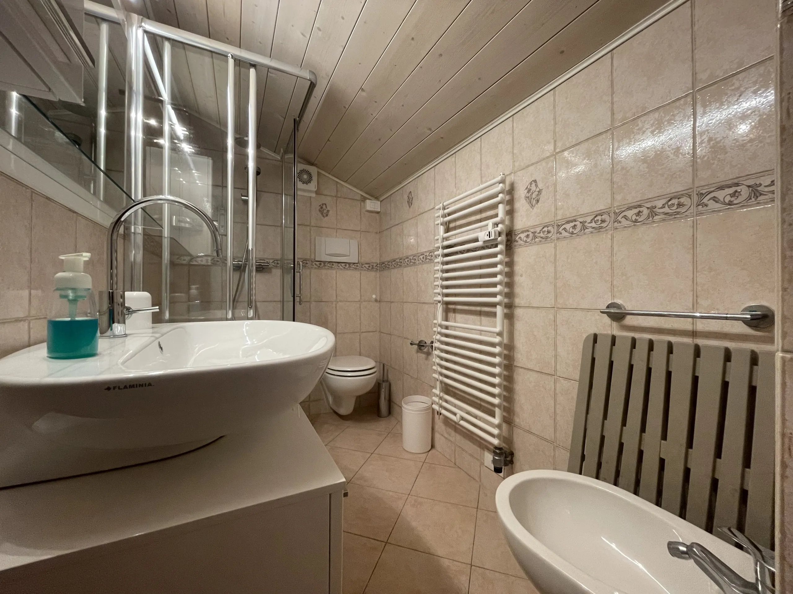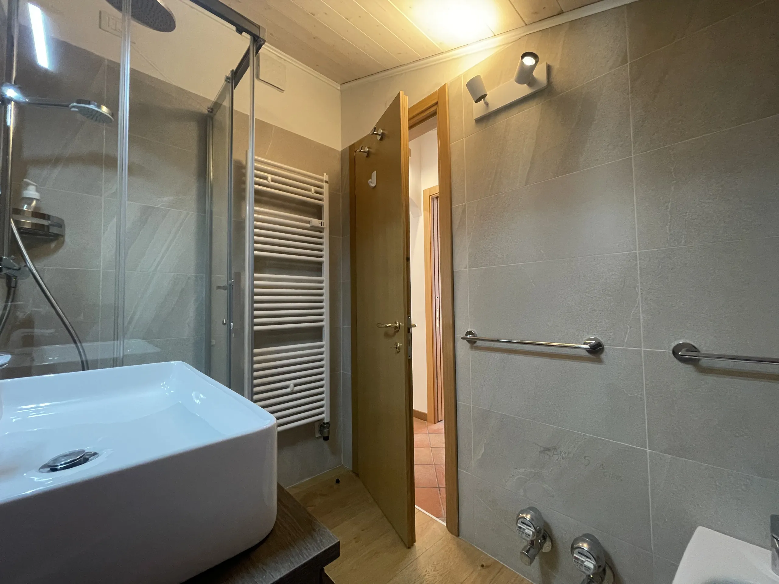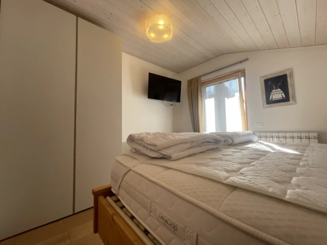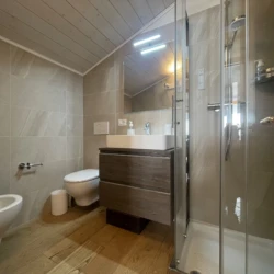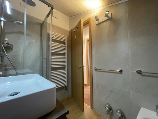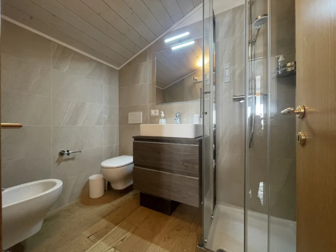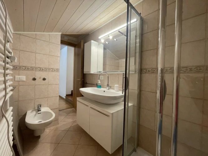 Completano l’appartamento un secondo bagno con doccia, box auto privato, armadietto porta sci e locale lavanderia condominiale.