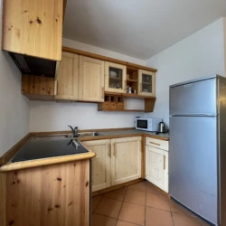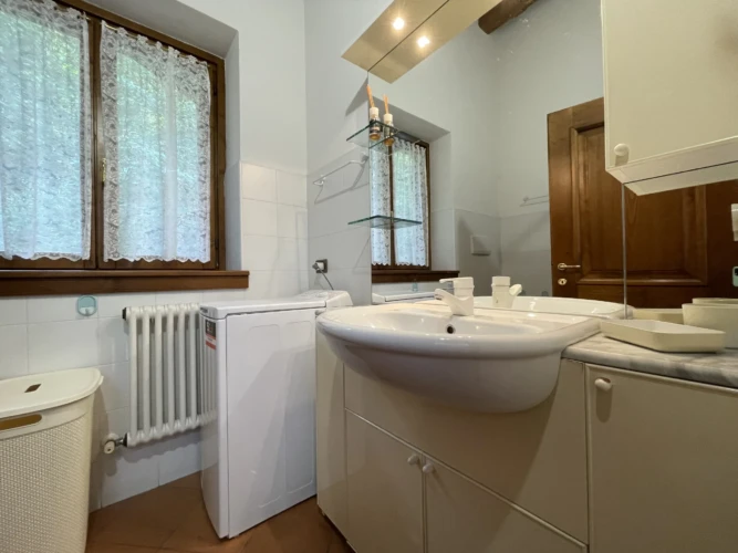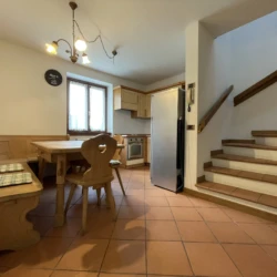 A Pinzolo, in zona panoramica e fuori dal traffico principale, appartamento su due livelli composto da ampio soggiorno con accesso all’esterno, angolo cottura, scale che portano al primo piano dove si trovano una stanza matrimoniale, stanza con letto a castello e letto singolo e e bagno finestrato con doccia e lavatrice. Posto auto scoperto a 150 m dall’edificio.