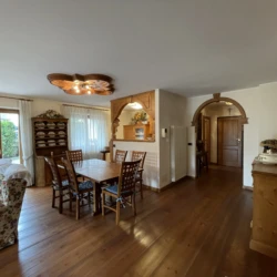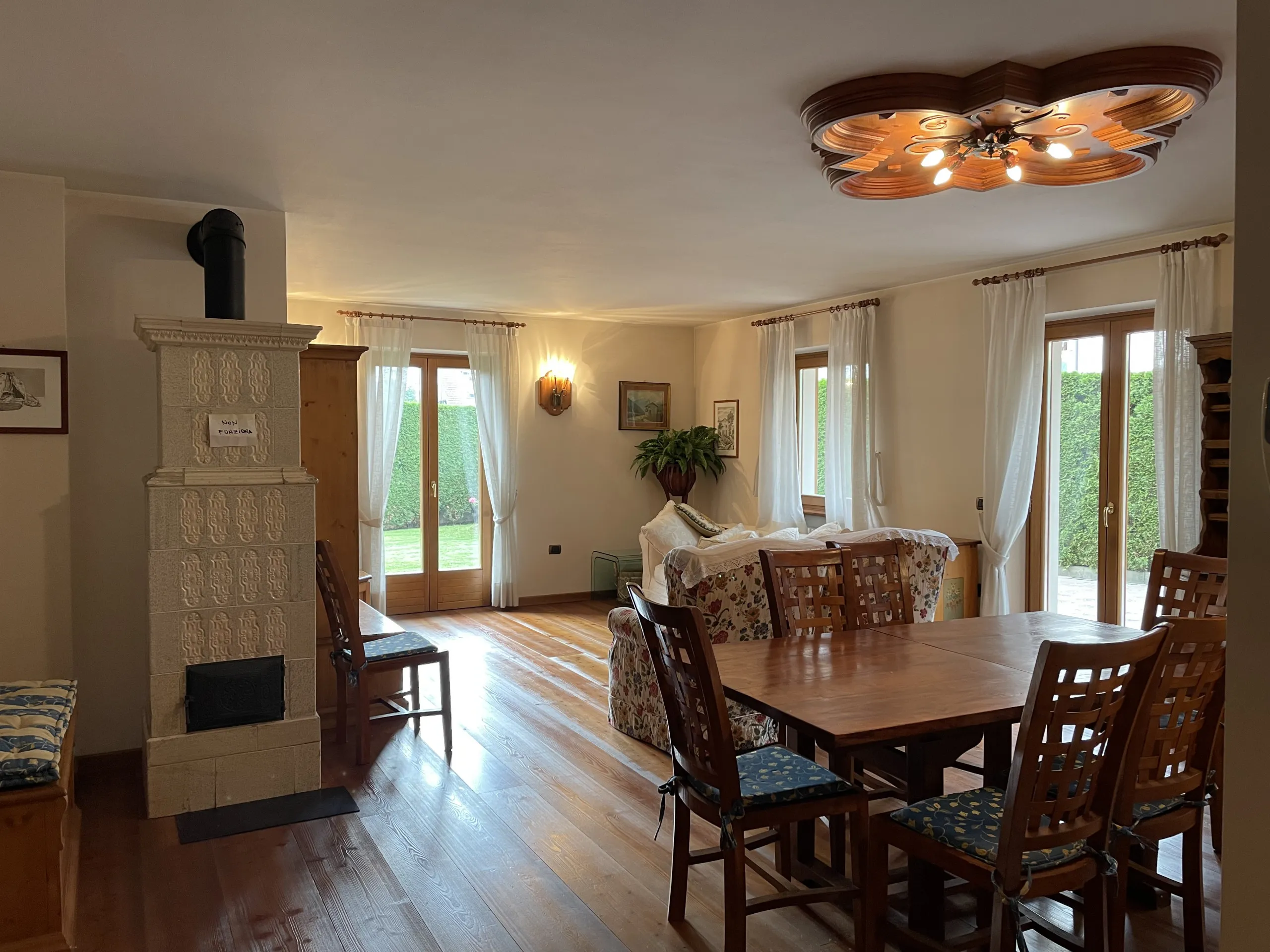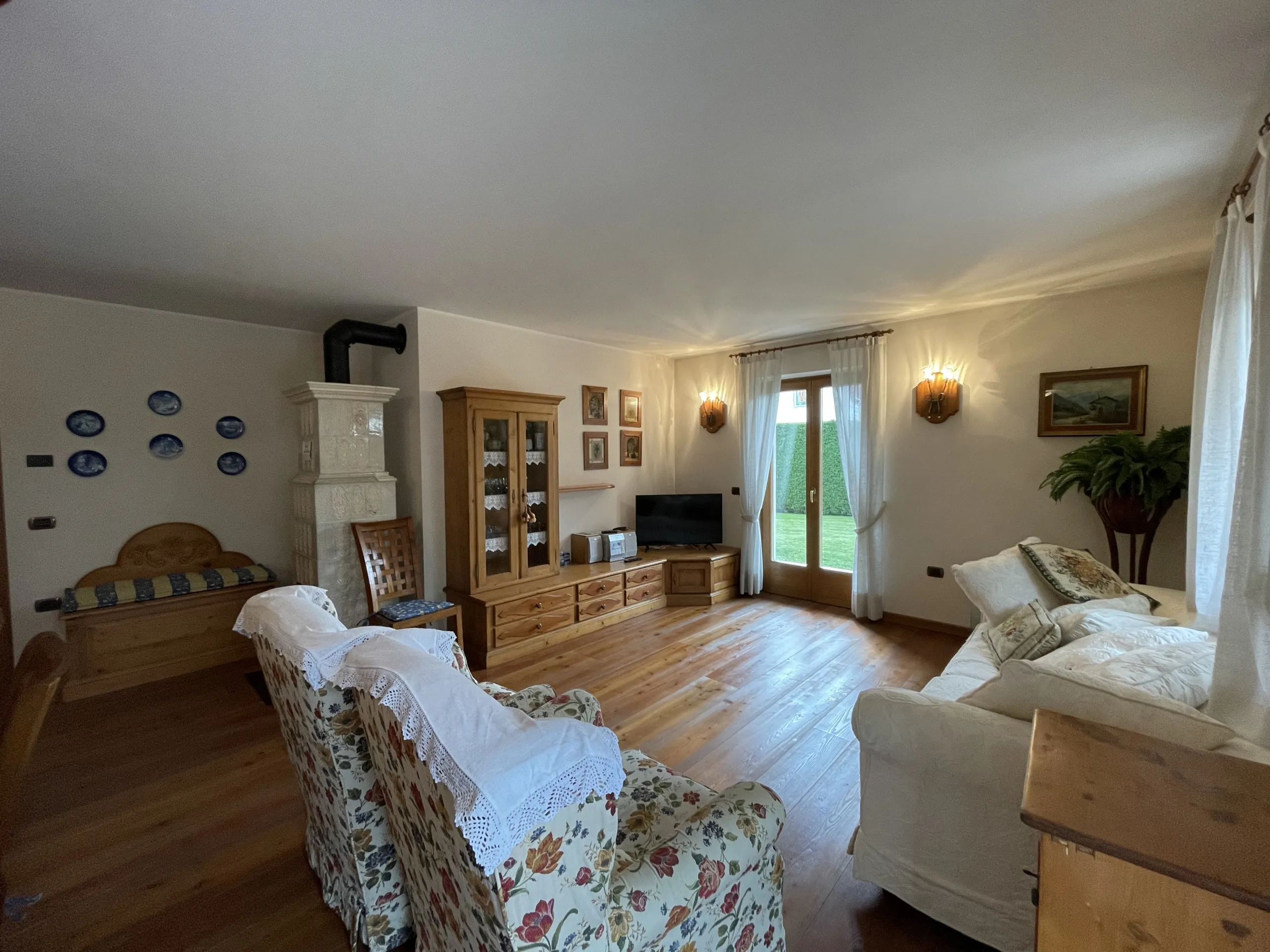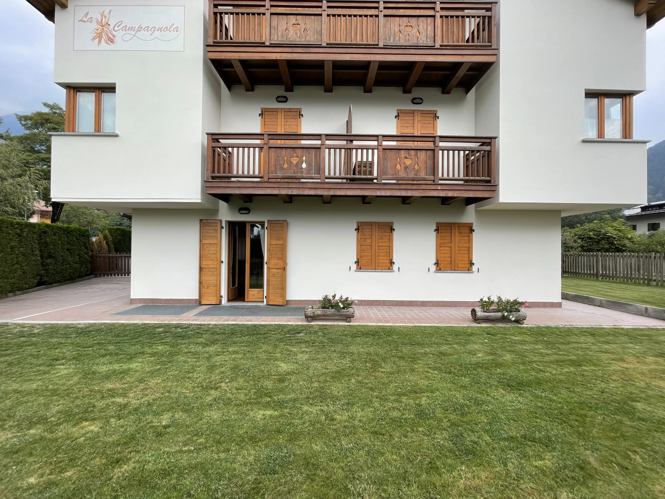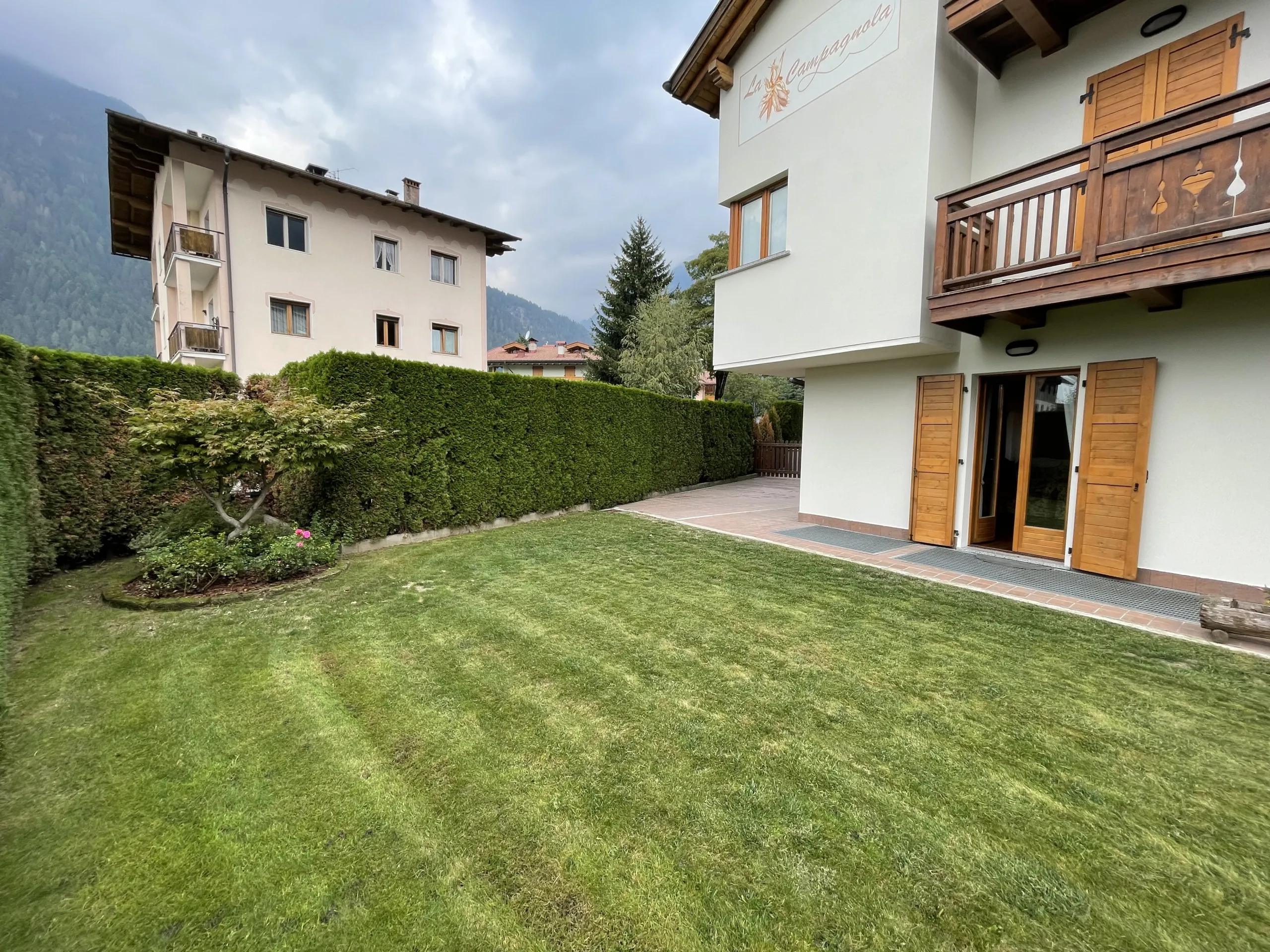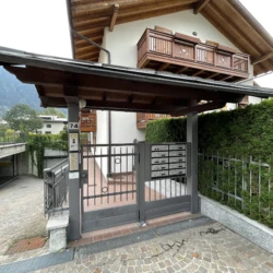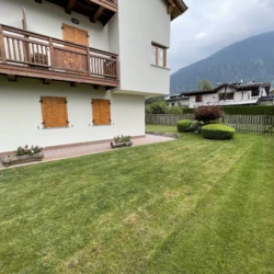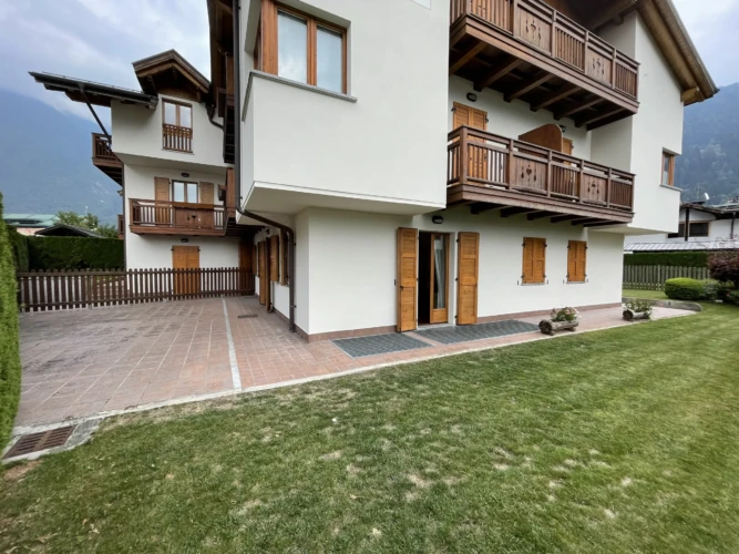 Quadrilocale a pian terreno con ampio giardino recintato, di esclusiva proprietà, in zona residenziale a Pinzolo. Non lontano dai principali servizi ed attività del paese, l’appartamento offre un ampio salone con cucina open space, e due comodi accessi al giardino circostante la casa. Nel disimpegno per la zona notte, troviamo l’accesso ad una camera matrimoniale con bagno (non finestrato), un luminoso secondo bagno, altra camera matrimoniale ed infine cameretta con letti a castello. Al piano seminterrato, box auto doppio. All’esterno del condominio, posto auto di proprietà.