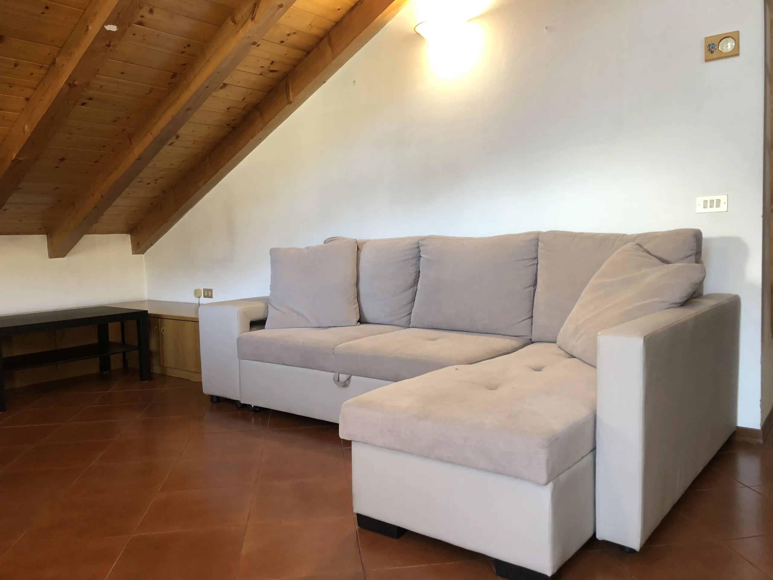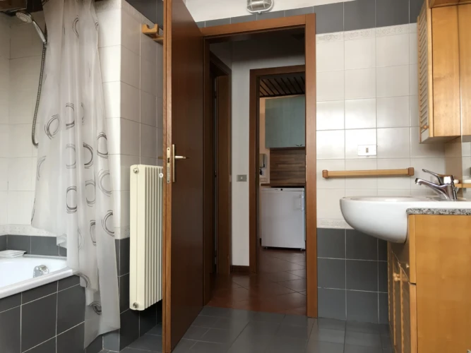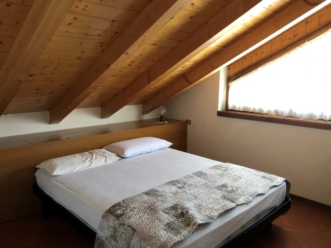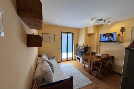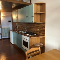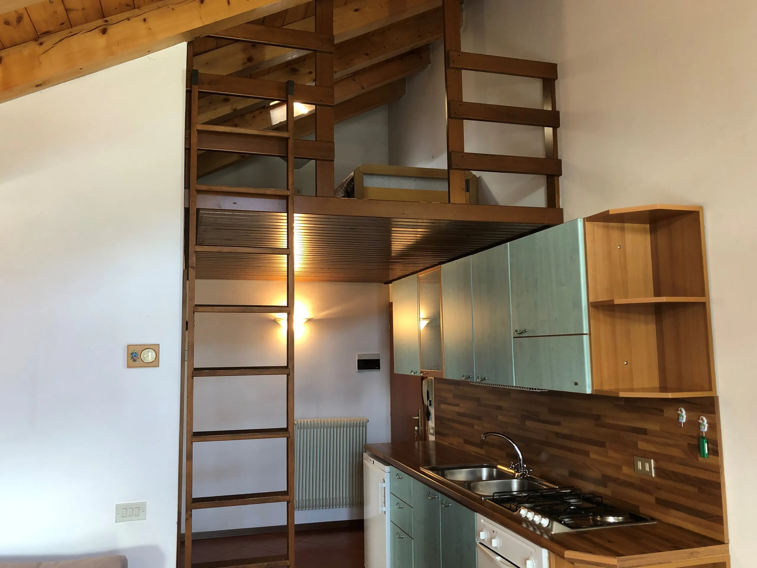 Ingresso, soggiorno con divano letto doppio, angolo cottura, soppalco con letto singolo, balcone esposto a sud, bagno finestrato con doccia e lavatrice, camera matrimoniale. Termo autonomo, dispone di posto auto privato in garage e cantina.