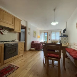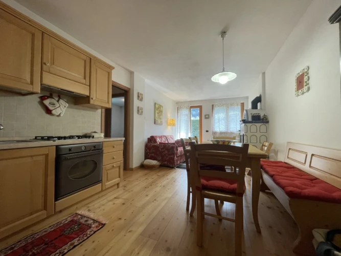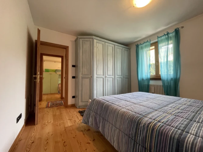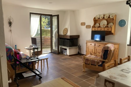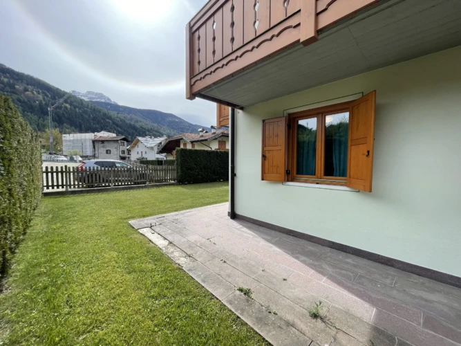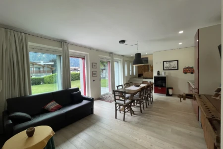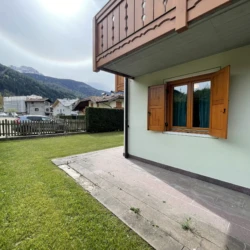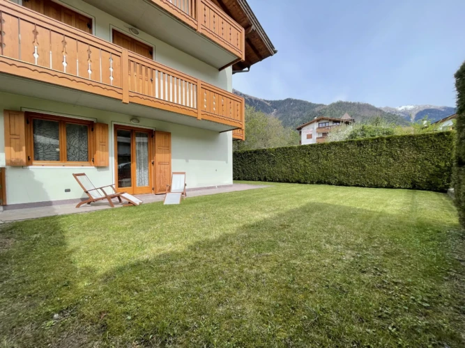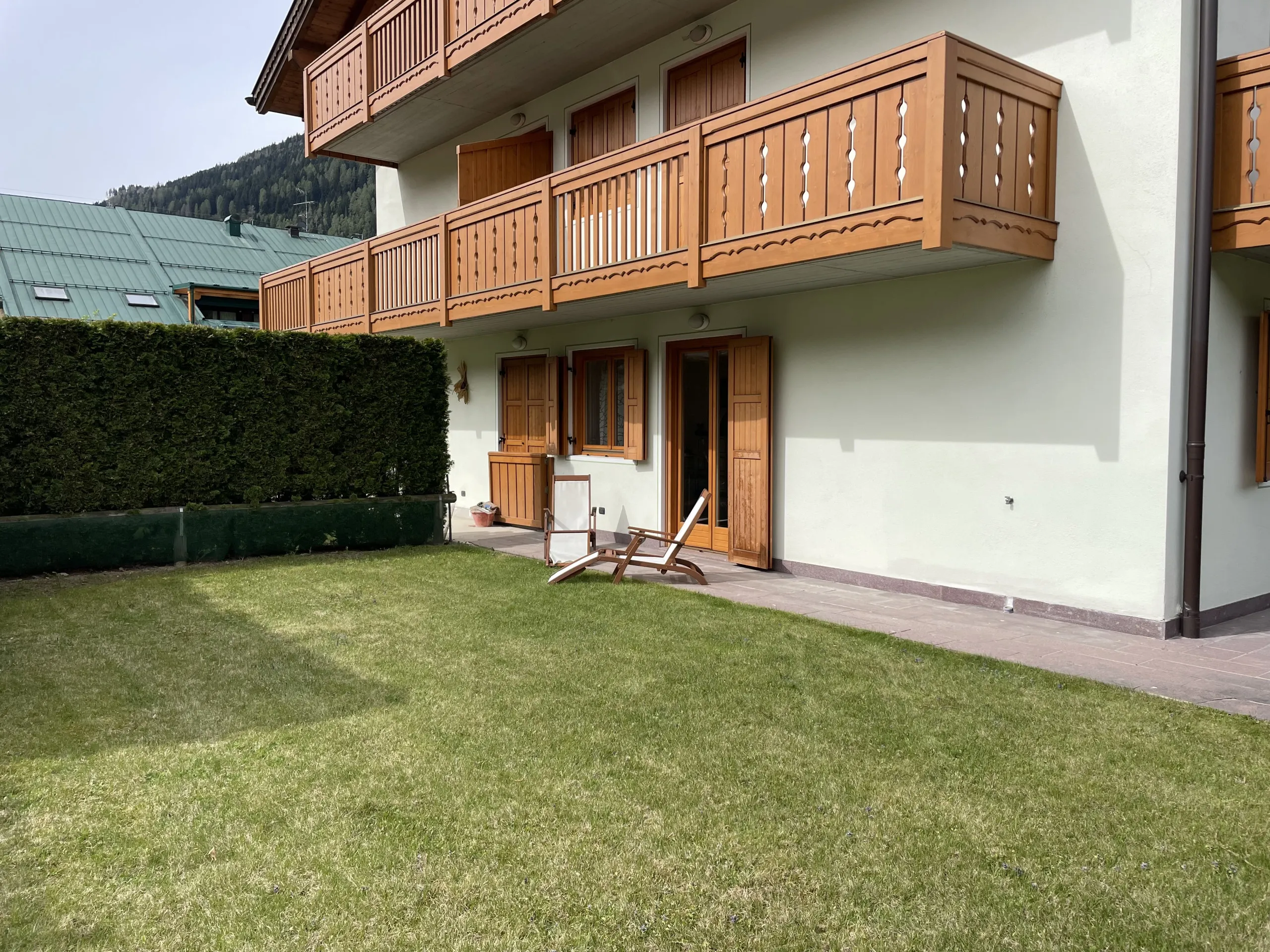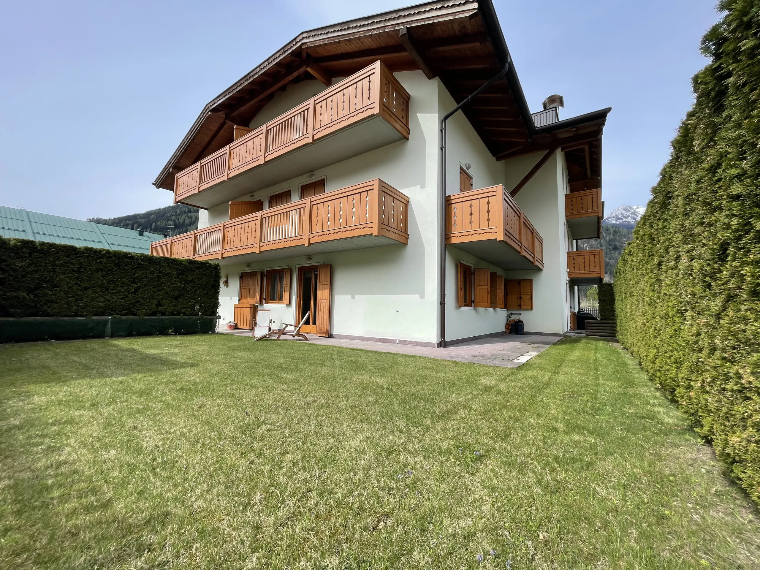 A Pinzolo, in zona tranquilla e riservata, non lontana dalle Funivie di Pinzolo, luminoso appartamento a piano terra composto da ingresso con soggiorno e cucina, porta finestra con accesso a magnifico giardino di esclusiva proprietà; disimpegno per la zona notte, spaziosa camera matrimoniale, bagno finestrato con doccia e lavatrice, infine cameretta con letti a castello sfalsati.