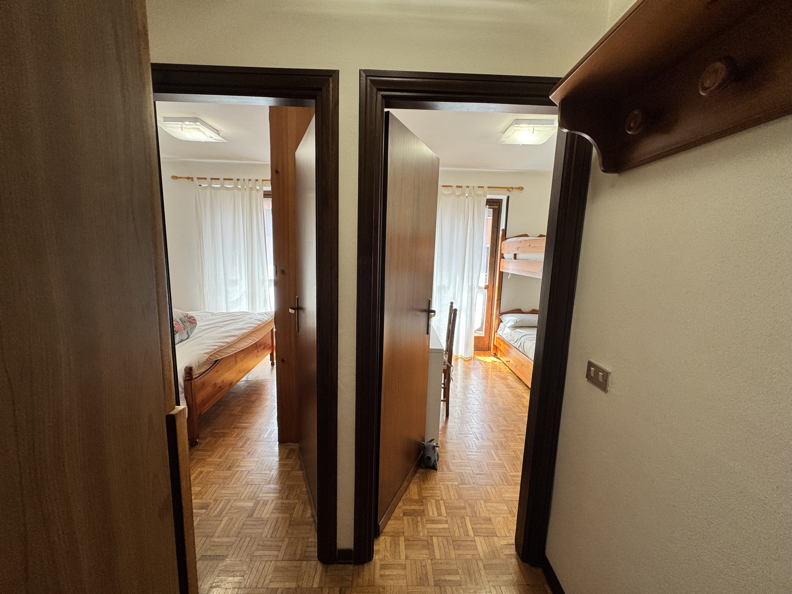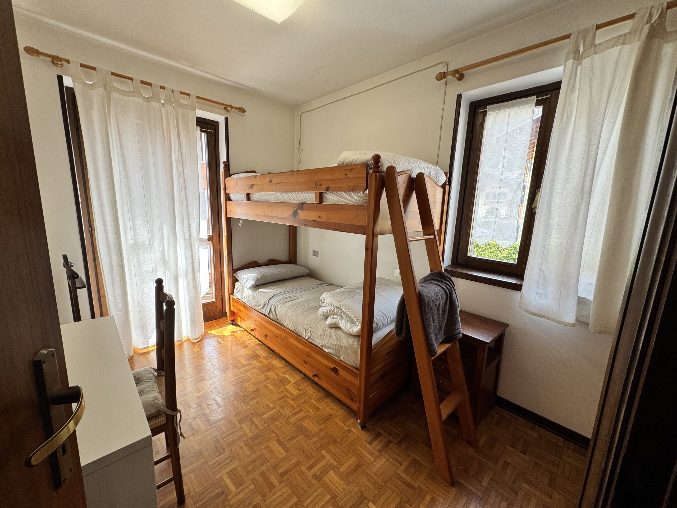 La zona notte comprende una camera matrimoniale con balcone, una cameretta con letto a castello e un bagno finestrato con doccia e lavatrice.