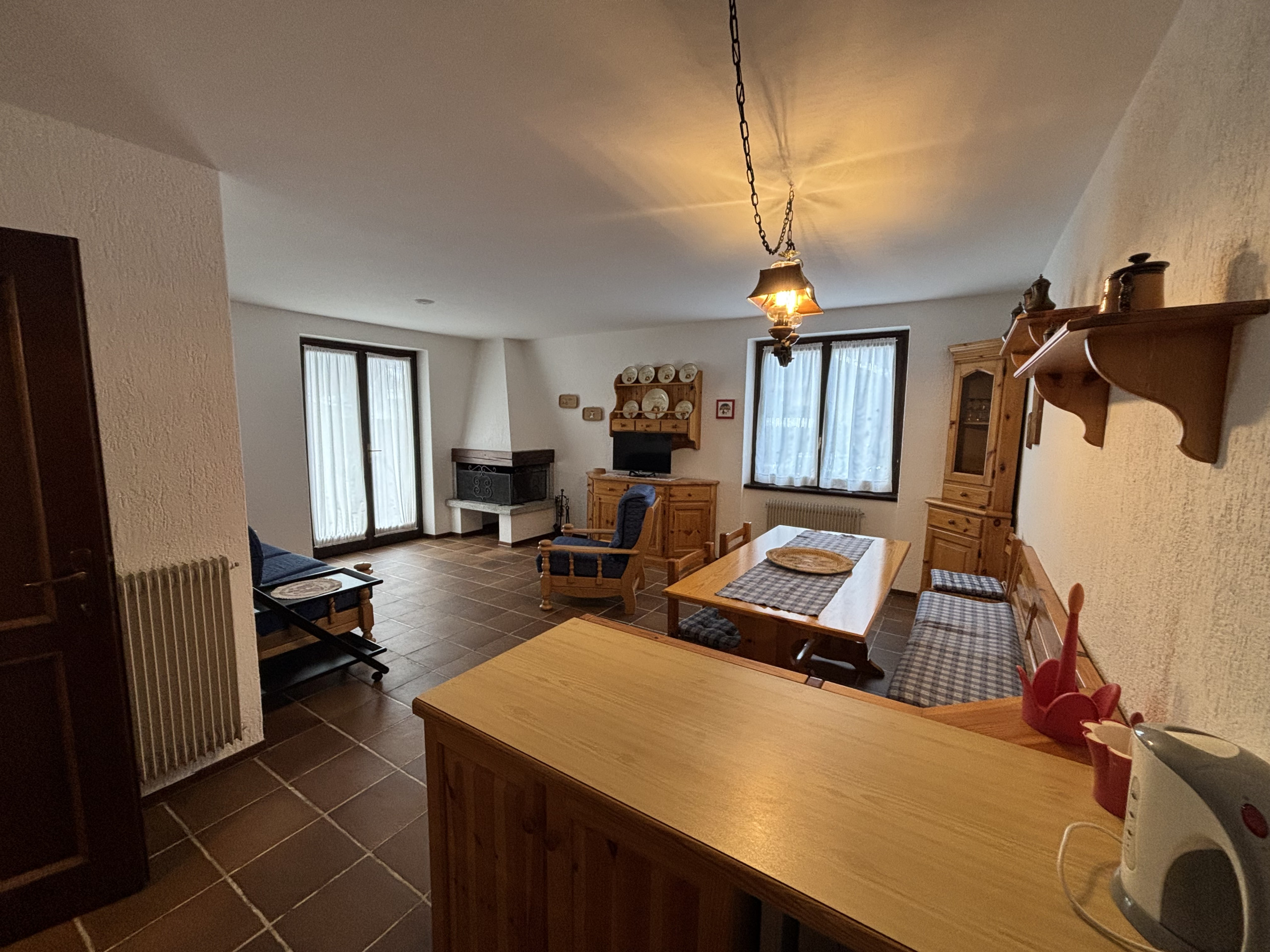 Composto da luminoso soggiorno con camino a legna e accesso diretto al giardino, angolo cottura, disimpegno, due camere da letto e bagno finestrato.