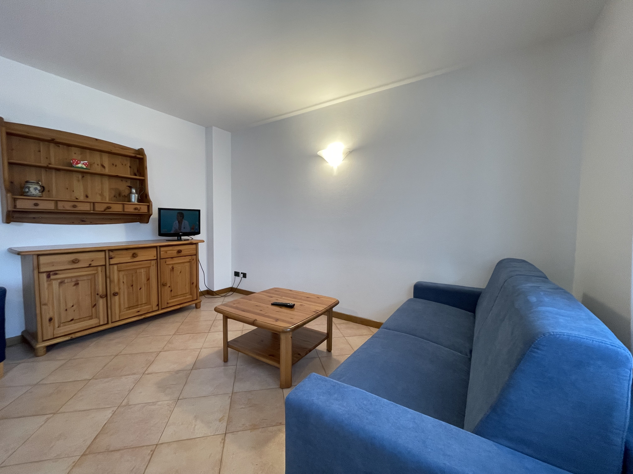 La zona giorno luminosa con divano letto si apre su un ampio balcone, perfetto per godersi il sole e la vista.
